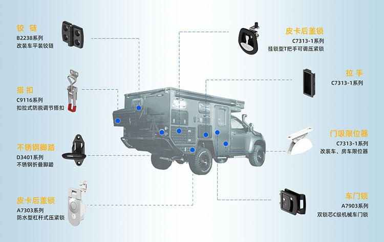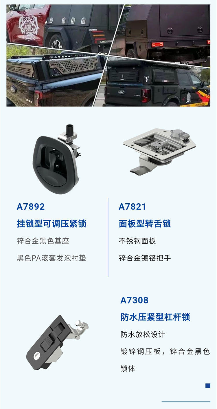 皮卡后蓋鎖:專為皮卡改裝車設(shè)計(jì)的工具箱鎖,堅(jiān)固耐用,易于操作,確保維修工具和應(yīng)急物品的隨時取用。多種功能型號可供選擇,有效防止貨物被盜。