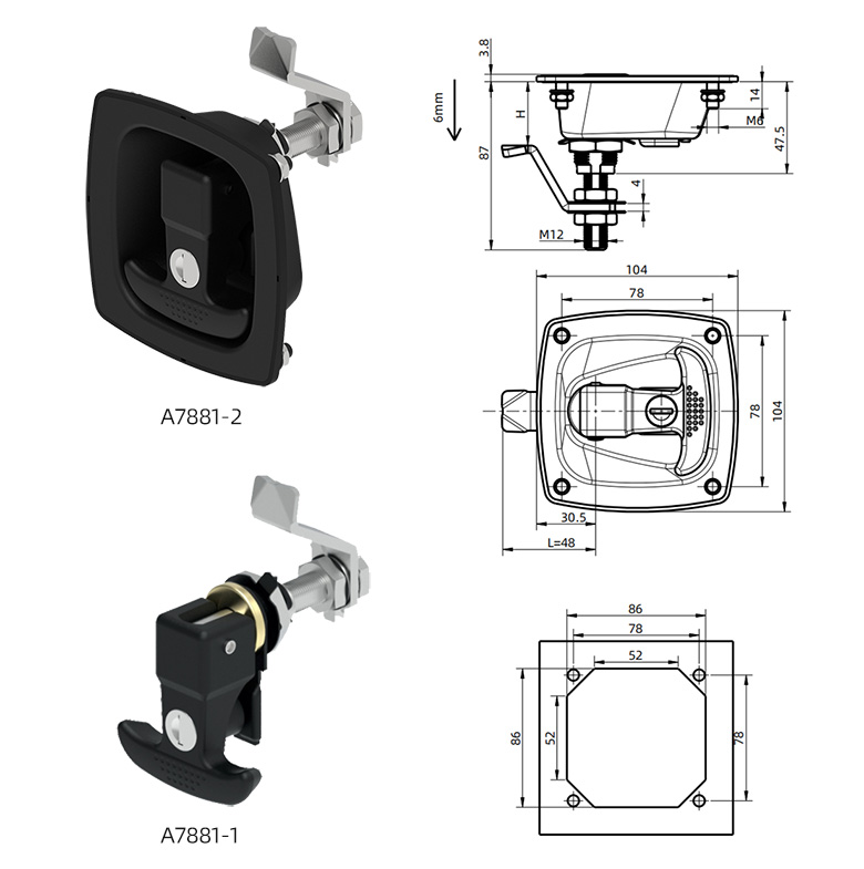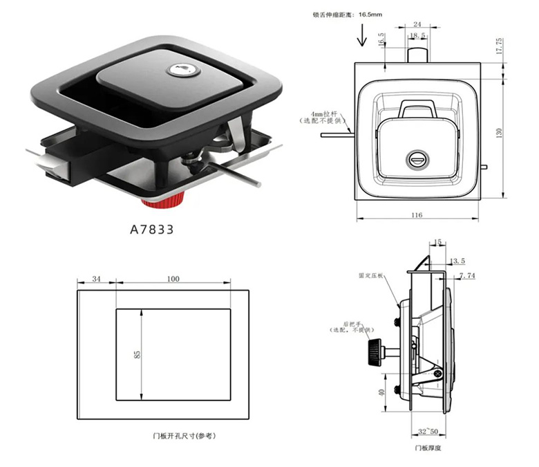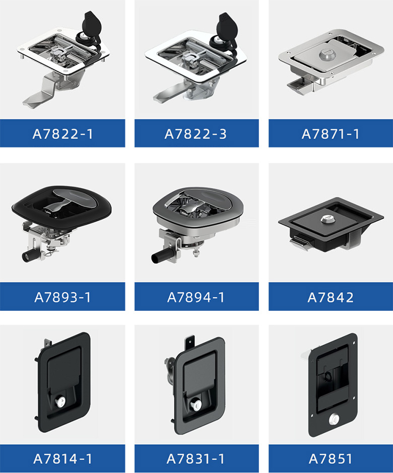 斯科A7833系列平面鎖,采用碳素鋼黑色噴涂面板,鋅合金黑色鎖體。安裝適配性高,專業(yè)防撞設(shè)計(jì)和防松設(shè)計(jì),具有防盜防撬,防腐蝕抗老化等功能,IP65防護(hù)等級,可應(yīng)對各種嚴(yán)苛的戶外環(huán)境??蛻艨筛鶕?jù)工具箱的整體設(shè)計(jì)需求,選擇不同材質(zhì)、表面處理、尺寸的提拉式面板鎖。