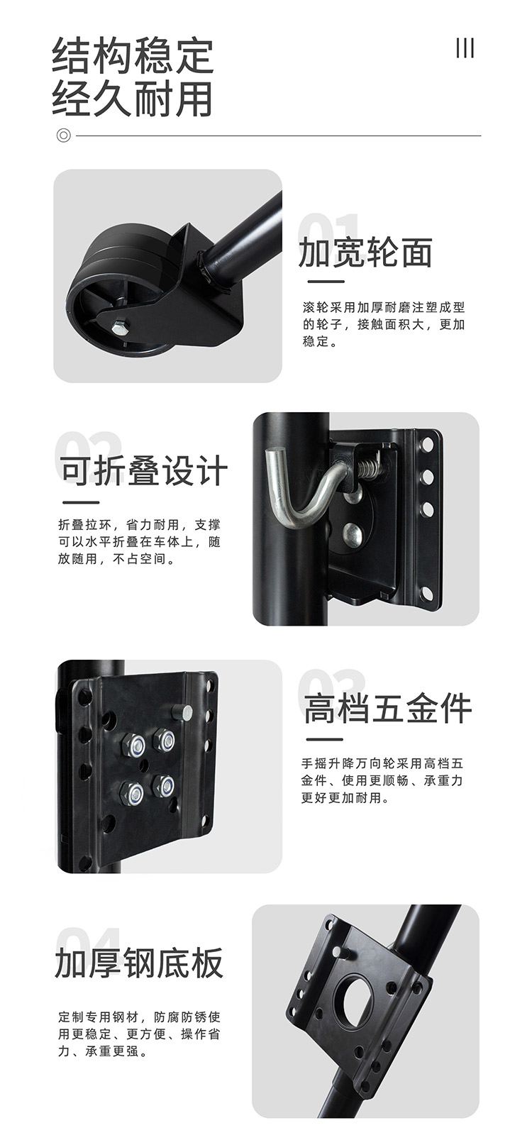 斯科的導(dǎo)向輪款千斤頂采用加寬輪面設(shè)計(jì)接觸面積更大,齒輪絲桿傳動(dòng)系統(tǒng)確保了操作的順暢與穩(wěn)定。無(wú)論是停在平坦的營(yíng)地還是稍微崎嶇的地面,都能提供足夠的支撐力。