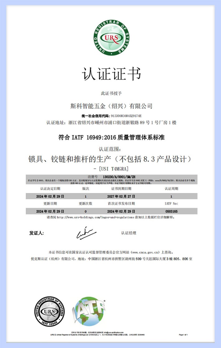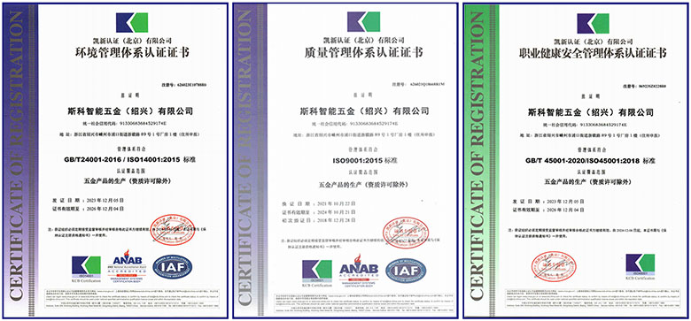 近日,斯科智能五金(紹興)有限公司以優(yōu)異成績順利通過了質(zhì)量、環(huán)境、職業(yè)健康安全以及16949國際汽車等四大管理體系認(rèn)證,并獲得四大管理體系認(rèn)證證書。這是對斯科智能五金管理體系的又一次權(quán)威認(rèn)證,標(biāo)志著斯科規(guī)范化和標(biāo)準(zhǔn)化達(dá)到新的水平。