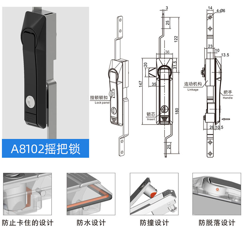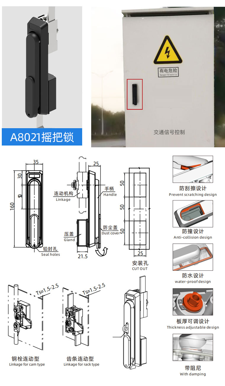 斯科搖把鎖系列產(chǎn)品在交通信號(hào)機(jī)柜應(yīng)用中發(fā)揮著重要作用。以下推薦的幾款搖把鎖鎖型全部達(dá)到IP65防護(hù)等級(jí)。鋅合金材質(zhì)以及特殊的表面處理提高了鎖體的硬度和耐腐蝕程度。適合交通信號(hào)機(jī)柜長期戶外使用。