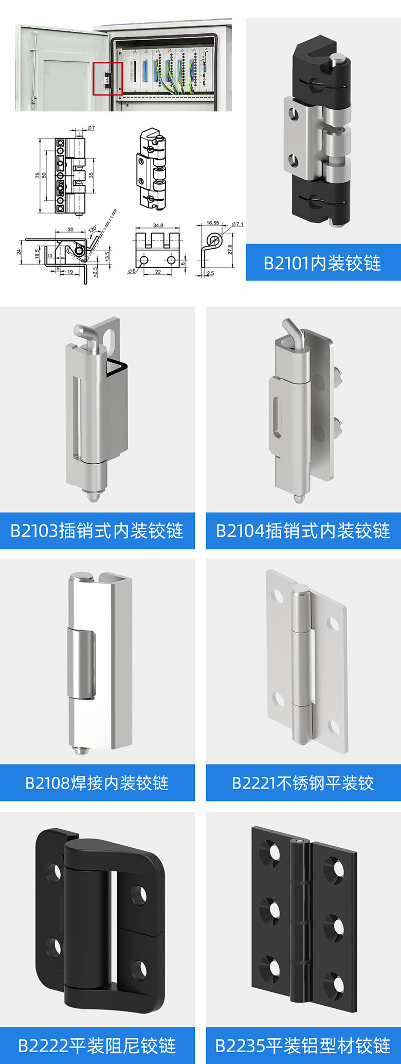 斯科鉸鏈?zhǔn)墙煌ㄐ盘?hào)機(jī)柜必須的零部件產(chǎn)品之一。斯科B2101系列內(nèi)裝鉸鏈已經(jīng)應(yīng)用于交通信號(hào)控制機(jī)柜產(chǎn)品中,這款鉸鏈采用鍍鋅鋼材質(zhì),防腐耐用,可確保交通信號(hào)機(jī)柜的應(yīng)用強(qiáng)度及使用壽命。