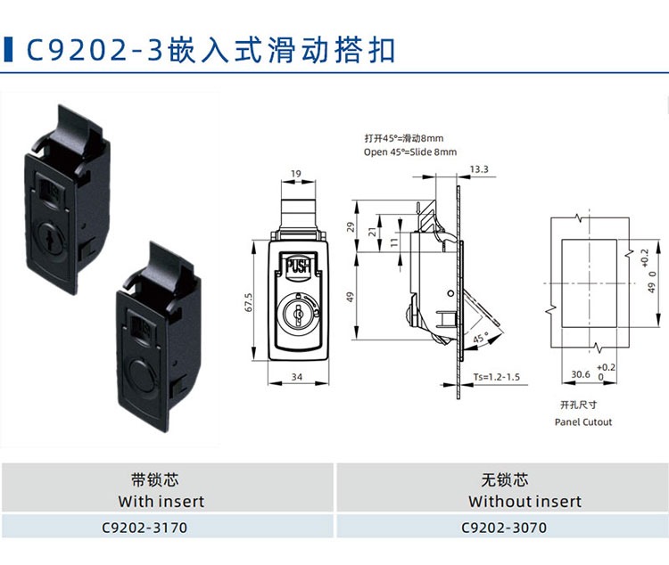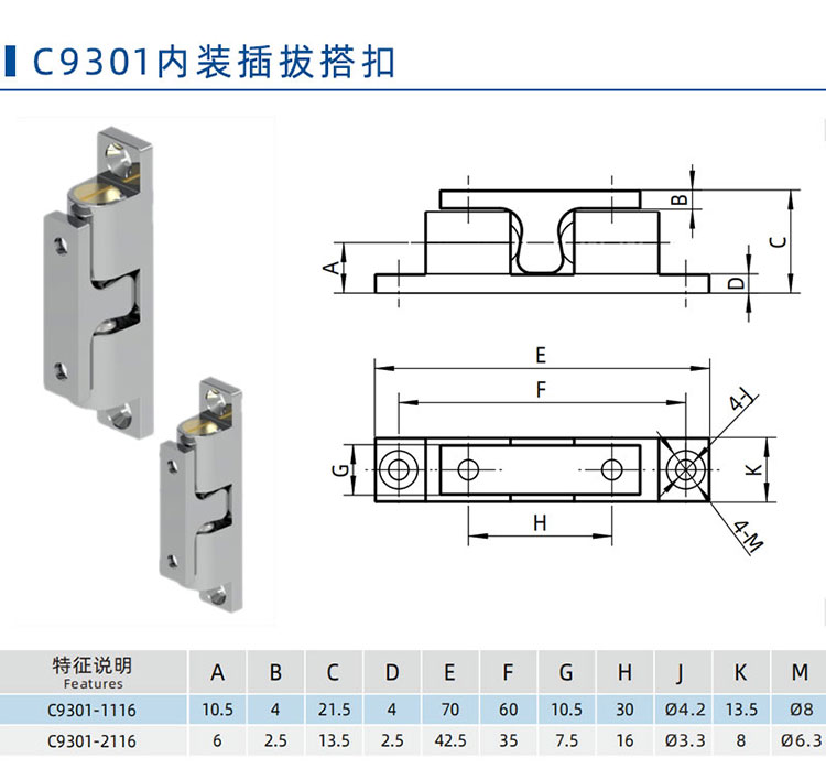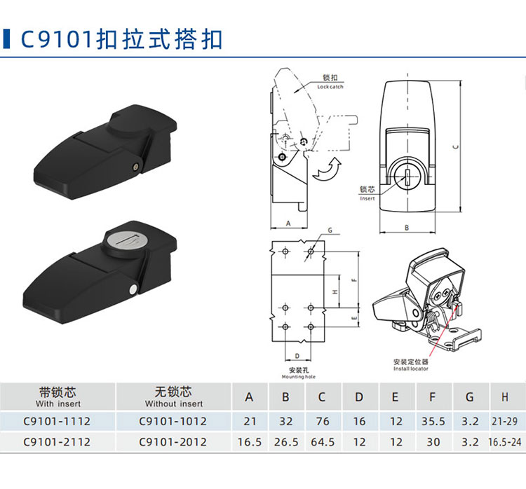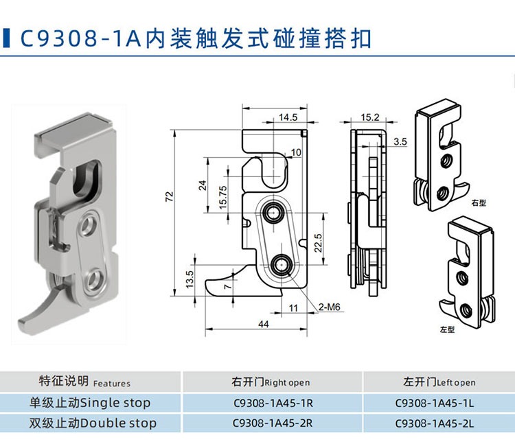 緊湊的設(shè)計(jì)提供隱藏操作,在關(guān)閉位置的容錯(cuò)公差使很小的操作力便可使門(mén)板關(guān)閉,并可提供安全穩(wěn)定的鎖定。耐用材料,防腐涂層以及結(jié)構(gòu)堅(jiān)固使得搭扣適用于苛刻環(huán)境。用途:各種車(chē)輛的平開(kāi)門(mén),推拉門(mén),后備箱等。