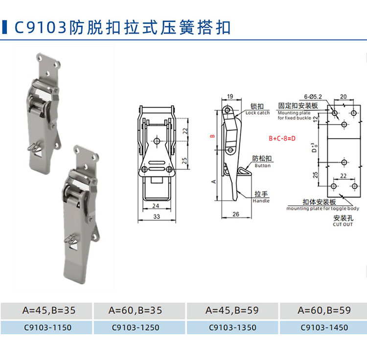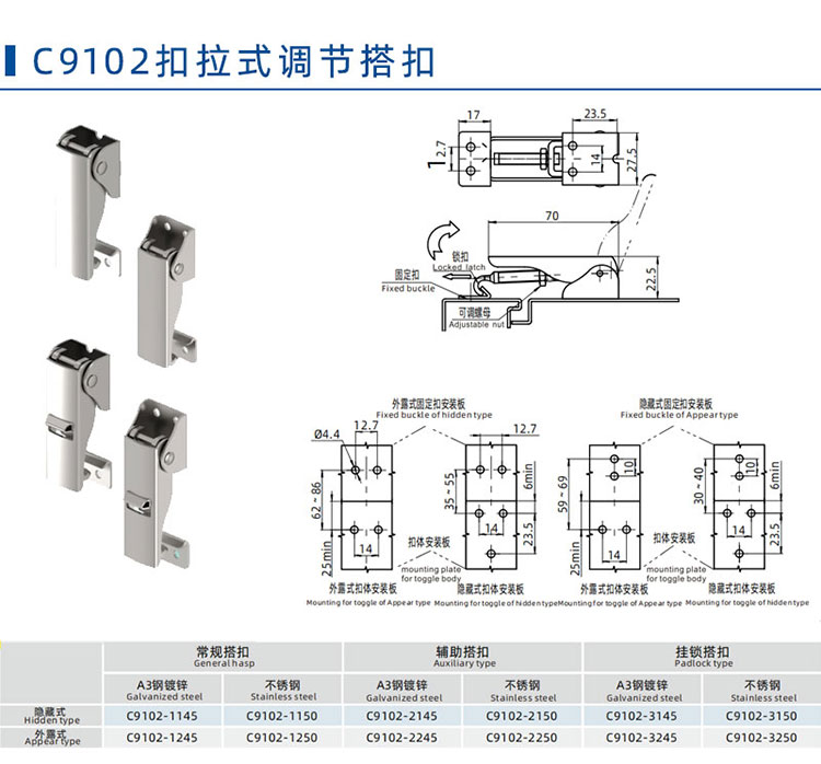 斯科五金始終致力于嚴(yán)格把控產(chǎn)品質(zhì)量以及滿足客戶需求。公司搭扣產(chǎn)品種類(lèi)豐富,涵蓋調(diào)節(jié)搭扣,微型搭扣,重型搭扣,彈簧搭扣,蝴蝶搭扣,通用搭扣,自鎖搭扣、車(chē)廂搭扣等多系列多款式精品。不僅具備多種容許載荷選擇,還有針對(duì)輕量小型箱體的產(chǎn)品,以及施工后可調(diào)節(jié)的型號(hào)??筛鶕?jù)使用場(chǎng)景和用途自由選擇。