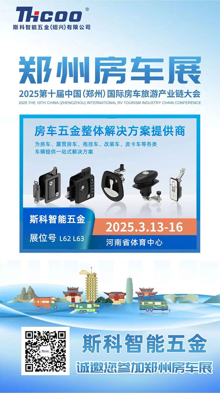 第十屆中國(鄭州)房車旅游產(chǎn)業(yè)鏈大會將于2025年3月13日-3月16日在河南省體育中心盛大舉行,為期四天。斯科將亮相本屆鄭州國際房車展,以全新的面貌和豐富的產(chǎn)品線,向廣大觀眾展示在房車五金配件領(lǐng)域的最新成果和創(chuàng)新技術(shù)。展位號:L62-L63,斯科誠邀您共赴盛會,共襄盛舉!