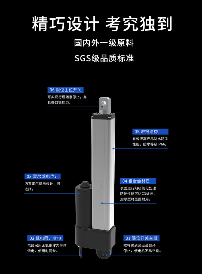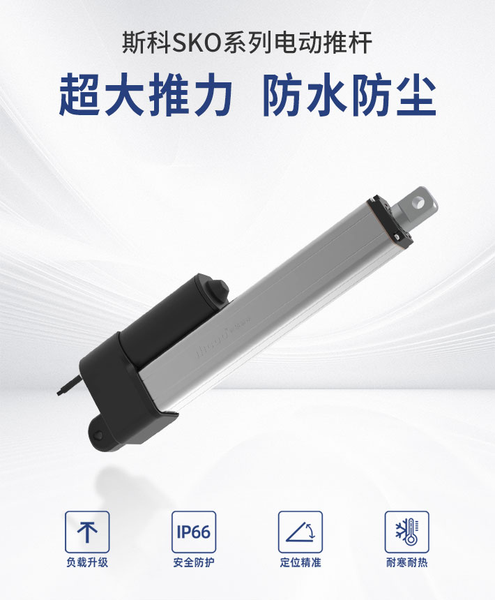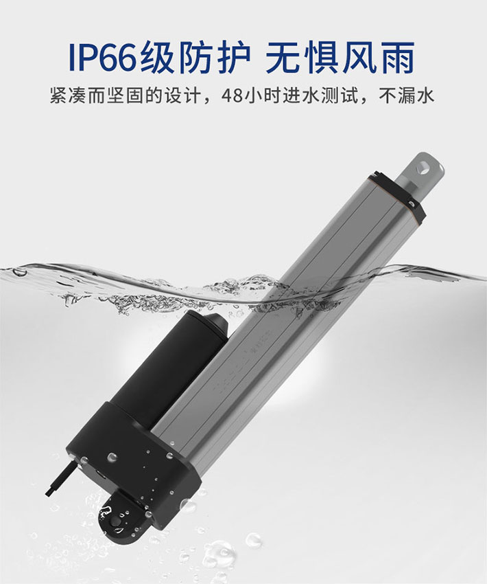 在應(yīng)用場景中,由于各種復(fù)雜的環(huán)境,電動推桿防水防塵技術(shù)是至關(guān)重要的,斯科推桿擁有IP66高防護(hù)等級(防水防塵),傳統(tǒng)電動推桿的全方面改進(jìn)款,四角造型,精密貼合,電機內(nèi)置螺絲更防水,氣動件封閉原理,48小時進(jìn)水循環(huán)伸縮實驗測試,不漏水。